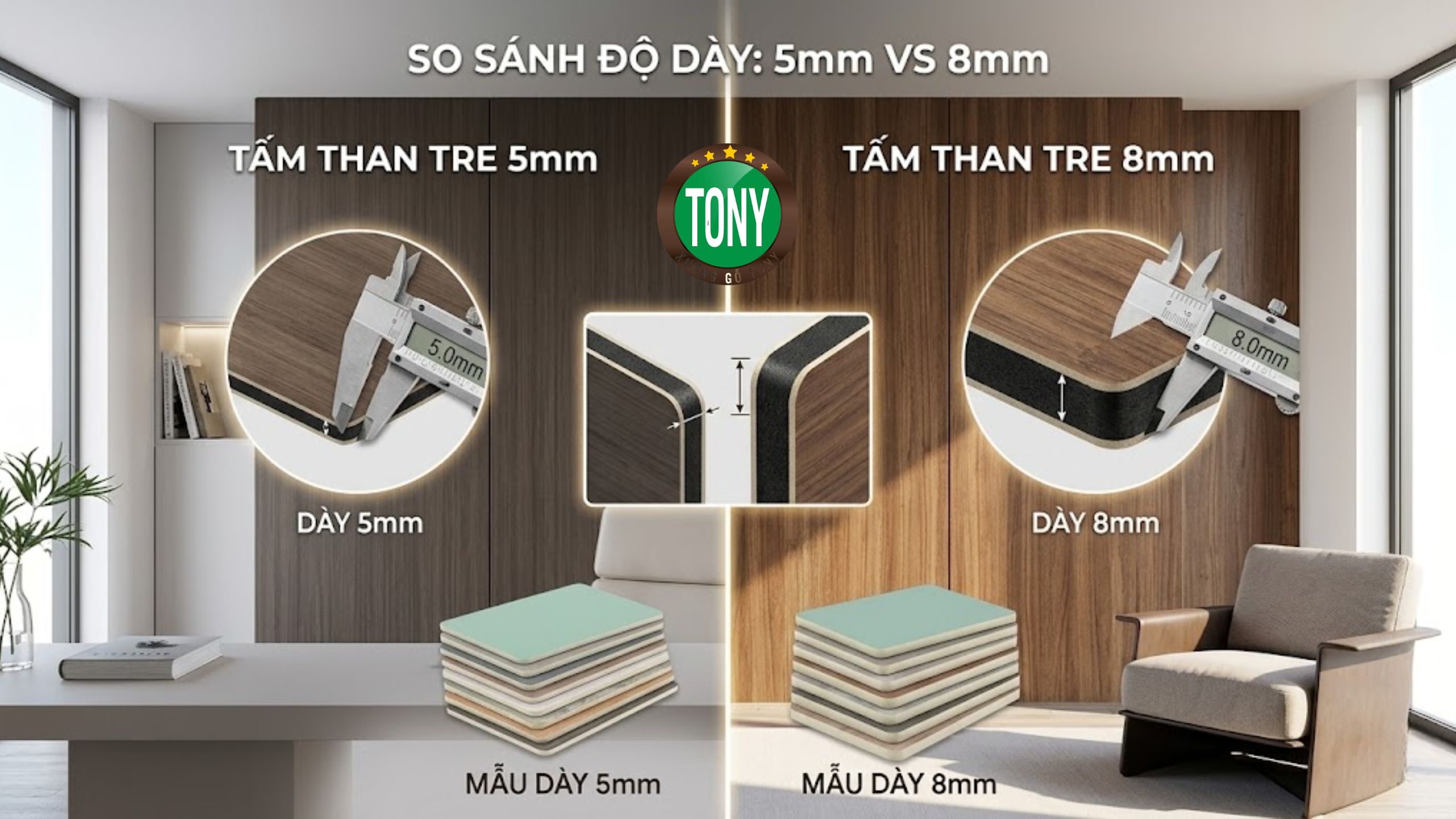 - Để biết Nên chọn tấm ốp than tre 5mm hay 8mm, trước tiên chúng ta cần hiểu rõ sự khác biệt về thông số kỹ thuật của hai loại vật liệu này. Về cơ bản, cả hai đều có chung kích thước tiêu chuẩn là 1220x2440mm hoặc 1220x2800mm, cấu tạo từ bột tre và hạt nhựa an toàn. Tuy nhiên, sự khác biệt lớn nhất nằm ở độ dày và trọng lượng riêng của từng tấm.