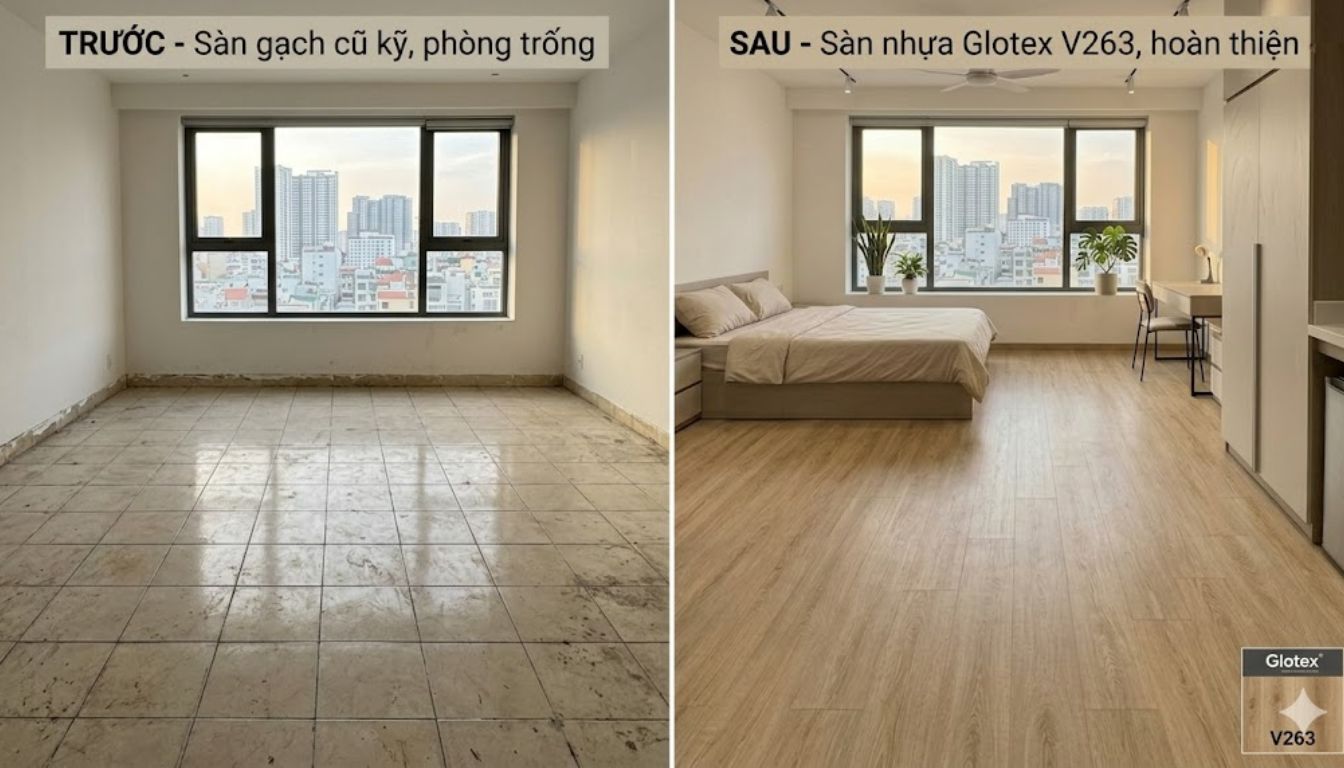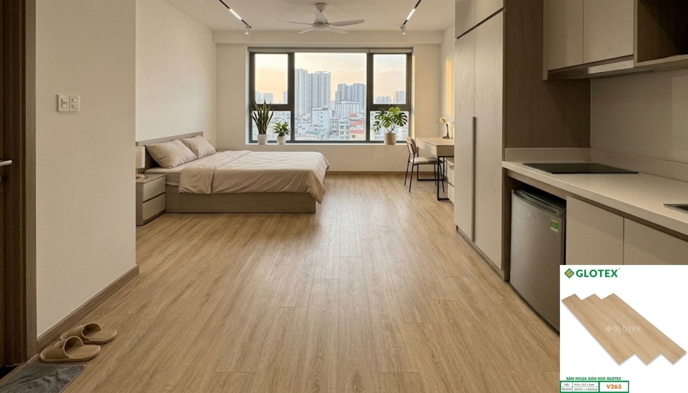 Sàn nhựa giả gỗ giá rẻ V263 – tông gỗ vàng kem ấm áp, sang trọng như căn hộ cao cấp, thi công xong trong ngày mà không cần đập một viên gạch nào.