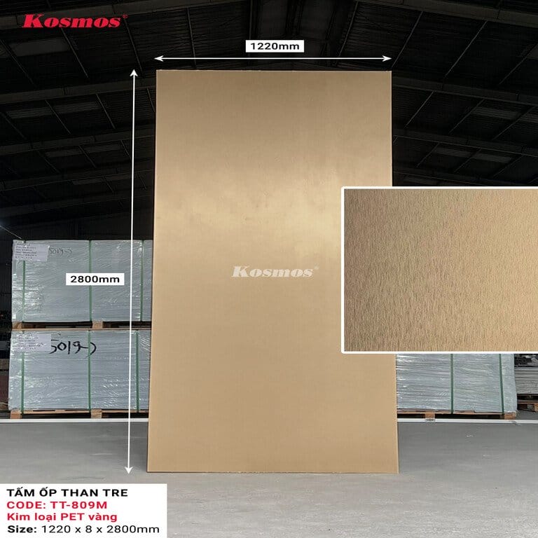 Tấm ốp sợi than tre Kosmos TT-809 có thiết kế kim loại PET vàng với các đặc điểm nổi bật: