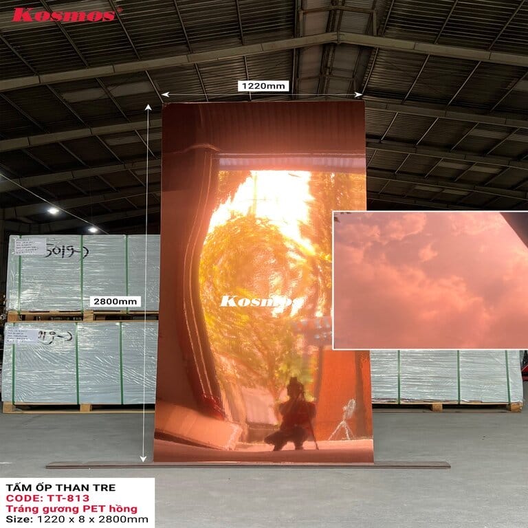 Tấm ốp sợi than tre Kosmos TT-813 có thiết kế tráng gương PET hồng với các đặc điểm nổi bật:
