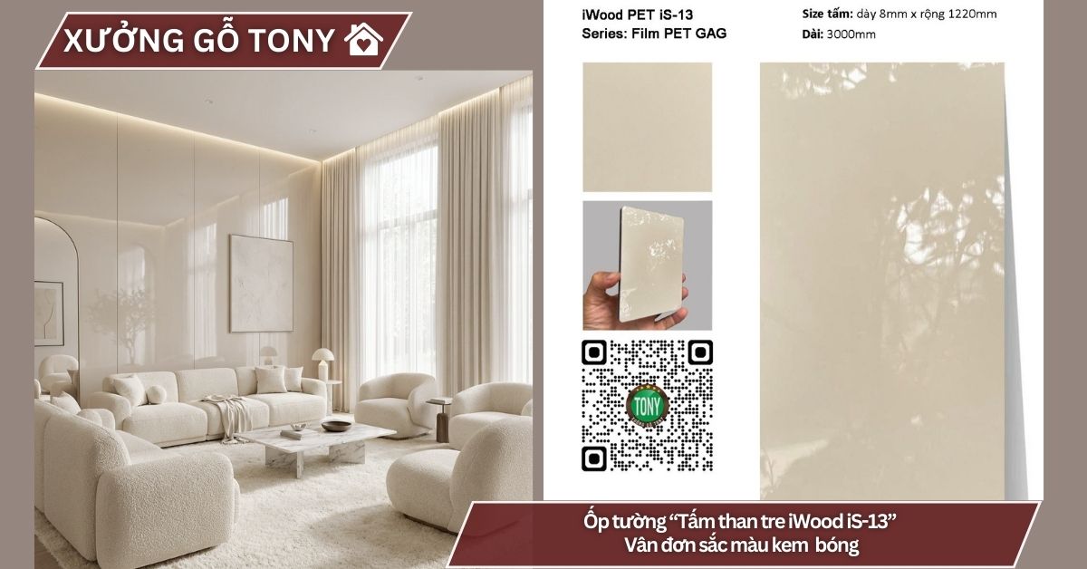 Tấm ốp than tre đơn sắc PET iS-13 gây ấn tượng với bề mặt PET kem bóng cao cấp – gam màu kem (cream/ivory/champagne) với bề mặt PET bóng như gương, mang lại cảm giác sang trọng, luxury và rất sophisticated. Bề mặt có độ bóng hoàn hảo, mang lại vẻ đẹp classic luxury, elegant và rất timeless.