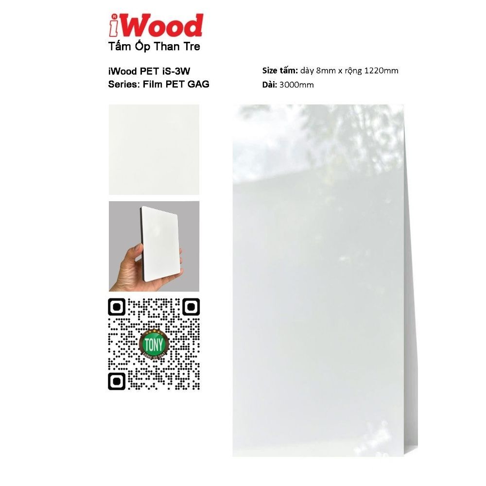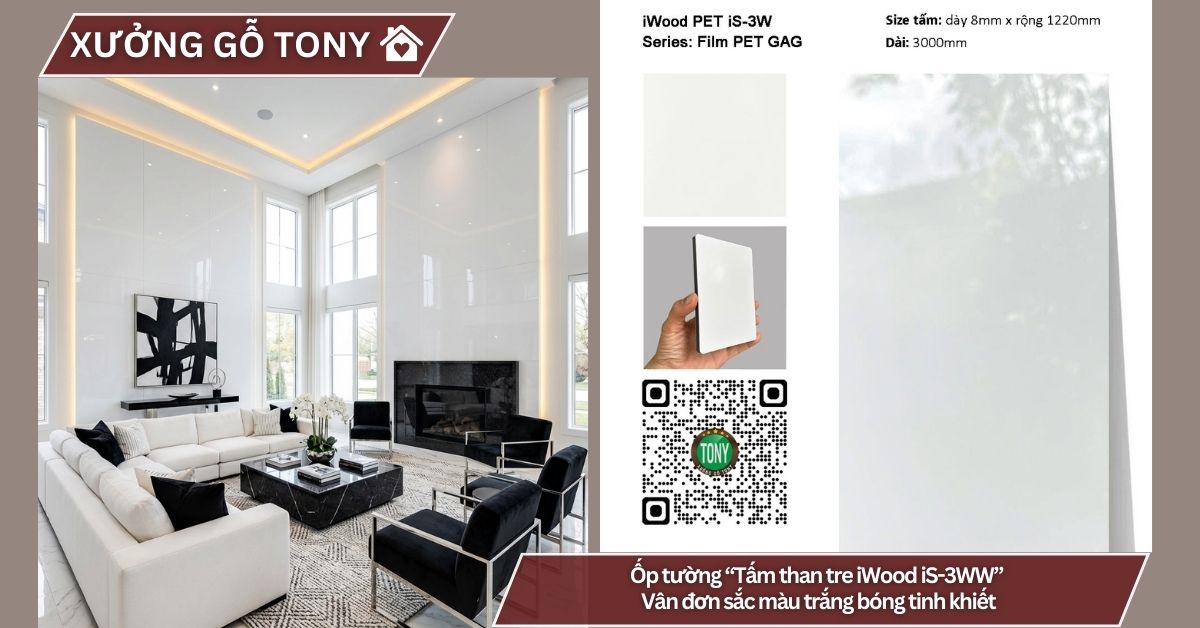 Tấm ốp than tre đơn sắc PET iS-3WW gây ấn tượng với bề mặt PET trắng bóng cao cấp – gam màu trắng tinh khiết (pure white/snow white/pristine white) với bề mặt PET bóng như gương, mang lại cảm giác tinh khiết, clean và rất minimalist. Bề mặt có độ bóng hoàn hảo, mang lại vẻ đẹp pure luxury, pristine và rất bright.