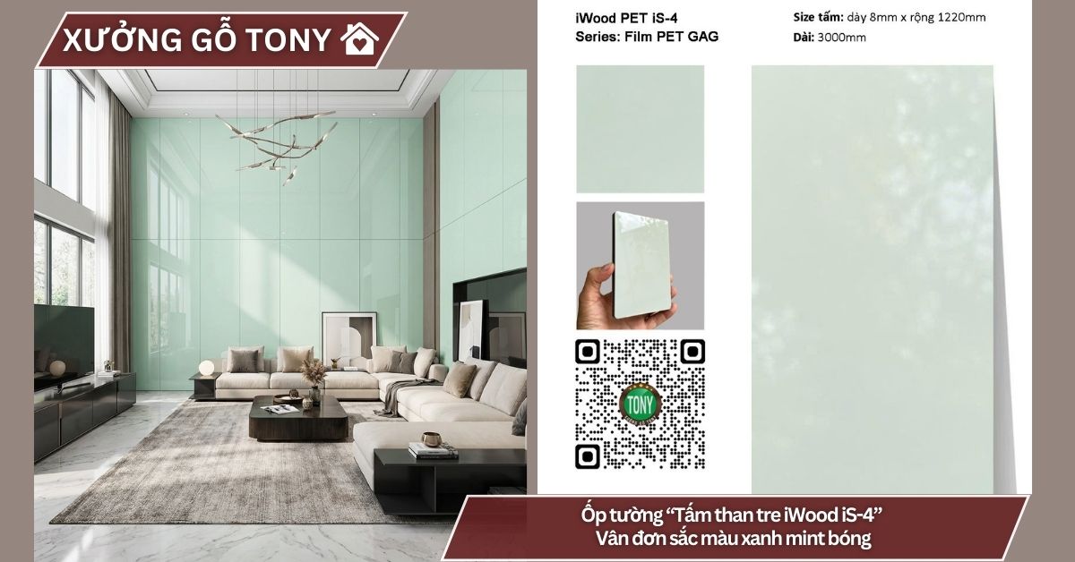 Tấm ốp than tre đơn sắc PET iS-4 gây ấn tượng với bề mặt PET xanh mint bóng cao cấp – gam màu xanh mint (mint green/sage green) với bề mặt PET bóng như gương, mang lại cảm giác tươi mát, thư giãn và rất tích cực. Bề mặt có độ bóng hoàn hảo, mang lại vẻ đẹp fresh luxury, calming và rất sống động.