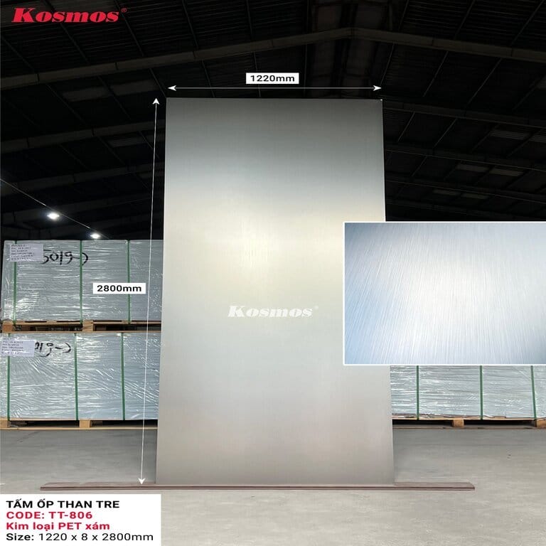Tấm ốp sợi than tre Kosmos TT-806 có thiết kế kim loại PET xám với các đặc điểm nổi bật: