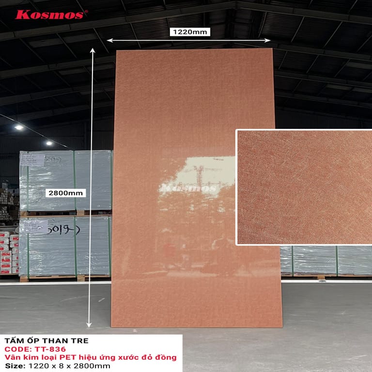 Tấm ốp than tre Kosmos TT-836 có thiết kế vân kim loại PET hiệu ứng xước đỏ đồng với các đặc điểm nổi bật:
