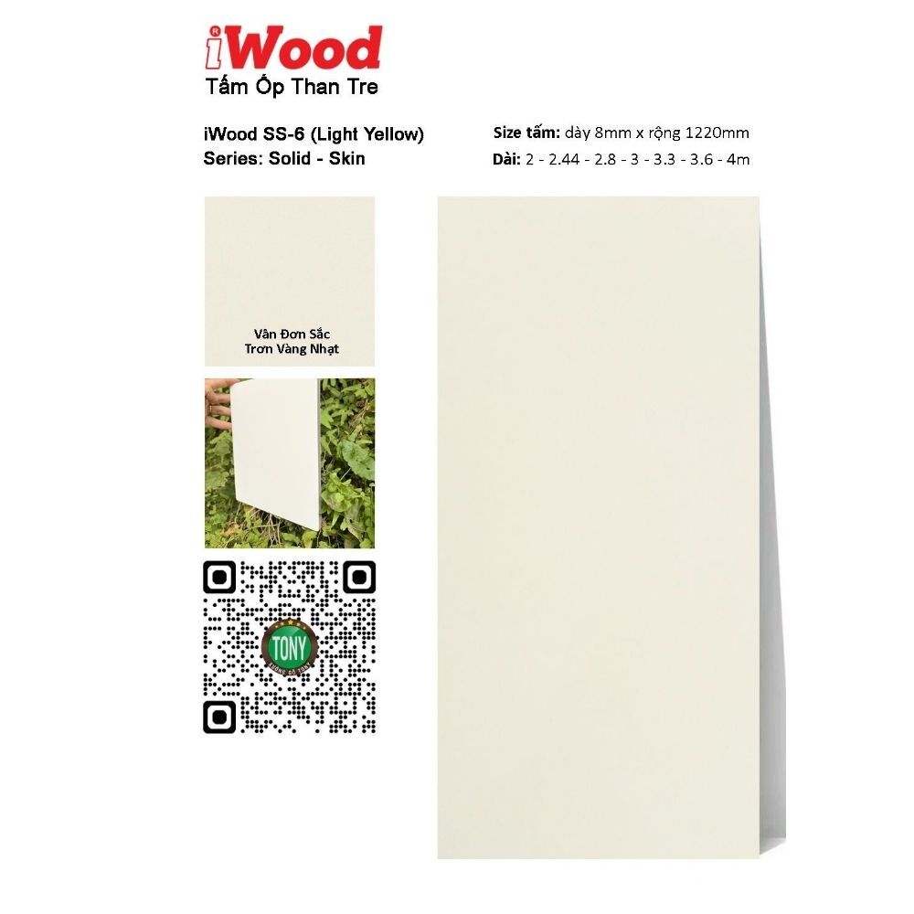 Tấm ốp than tre đơn sắc SS-6 – sản phẩm độc đáo từ thương hiệu iWood – chính là giải pháp hoàn hảo dành cho bạn! Với bề mặt vân đơn sắc trơn màu vàng nhạt dịu dàng, sản phẩm mang đến vẻ đẹp ấm áp, thanh lịch và rất tinh tế, tạo nên không gian sống dễ chịu, sang trọng và đầy cảm hứng.