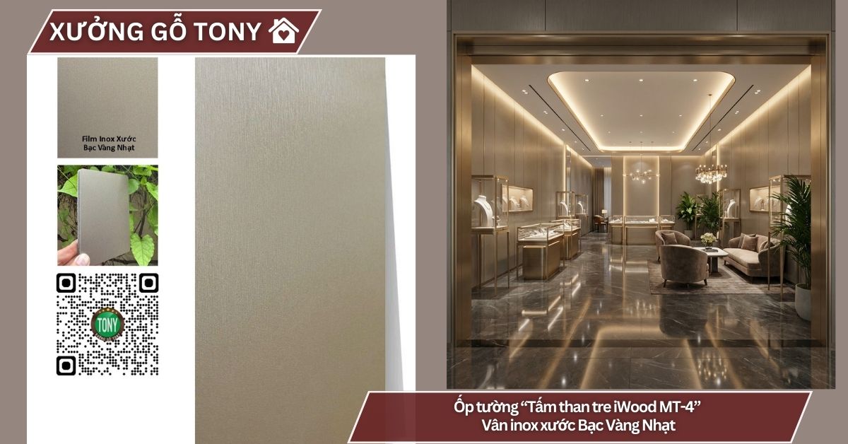 Tấm ốp than tre vân Inox xước MT-4 – sản phẩm độc đáo từ thương hiệu iWood – chính là giải pháp hoàn hảo dành cho bạn! Với bề mặt vân Inox xước màu bạc vàng nhạt sang trọng, sản phẩm mang đến vẻ đẹp kim loại ấm áp, đẳng cấp và rất tinh tế, tạo nên không gian sống sang trọng, hiện đại và đầy cảm hứng.