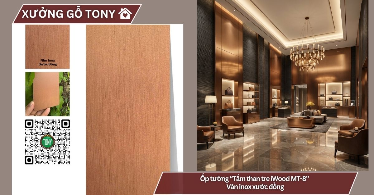 Tấm ốp than tre vân Inox MT-8 gây ấn tượng với bề mặt vân Inox xước màu đồng sang trọng – gam màu đồng ấm áp (copper/bronze tone) với hiệu ứng xước tự nhiên, mang lại cảm giác sang trọng, ấm cúng và rất đẳng cấp. Bề mặt có kết cấu kim loại đặc biệt với các đường vân xước dọc tinh tế, mang lại vẻ đẹp hiện đại, cao cấp và rất ấn tượng.