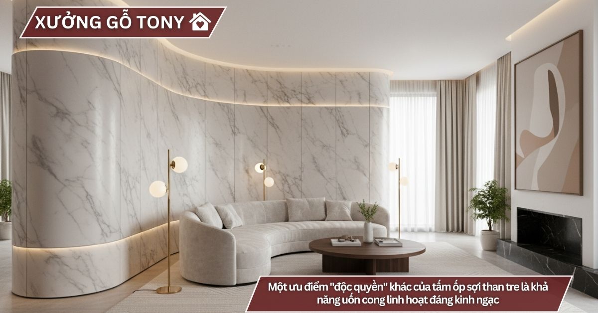 Sức hút của tấm ốp tường than tre không chỉ nằm ở vẻ ngoài hào nhoáng mà còn đến từ những đặc tính kỹ thuật ưu việt mà hiếm loại vật liệu nào sánh kịp. Đầu tiên phải kể đến khả năng chống nồm ẩm và mối mọt tuyệt đối. Với cốt than tre hoạt tính, sản phẩm có khả năng kháng khuẩn, ngăn ngừa sự phát triển của nấm mốc, cực kỳ phù hợp với khí hậu nhiệt đới gió mùa nóng ẩm tại Việt Nam. Một ưu điểm “độc quyền” khác của tấm ốp sợi than tre là khả năng thi công linh hoạt đáng kinh ngạc. Nhờ tính chất dẻo dai của nhựa resin và bột tre, tấm ốp có thể dễ dàng soi rãnh, gấp cạnh, bo góc tròn hoặc uốn cong theo các thiết kế tường vòm, cột trụ mà không bị gãy hay rạn nứt. Điều này cho phép các kiến trúc sư thỏa sức sáng tạo những đường cong mềm mại, tinh tế trong không gian nội thất. Ngoài ra, trọng lượng nhẹ của tấm ốp tường than tre giúp giảm tải trọng lên kết cấu công trình và rút ngắn đáng kể thời gian thi công. Việc lắp đặt diễn ra nhanh chóng, ít bụi bẩn, không gây tiếng ồn lớn, giúp gia chủ có thể dọn vào ở ngay sau khi hoàn thiện. Hơn nữa, bề mặt sản phẩm rất dễ vệ sinh, chỉ cần lau chùi nhẹ nhàng là đã sáng bóng như mới, giúp tiết kiệm thời gian bảo dưỡng cho người sử dụng.