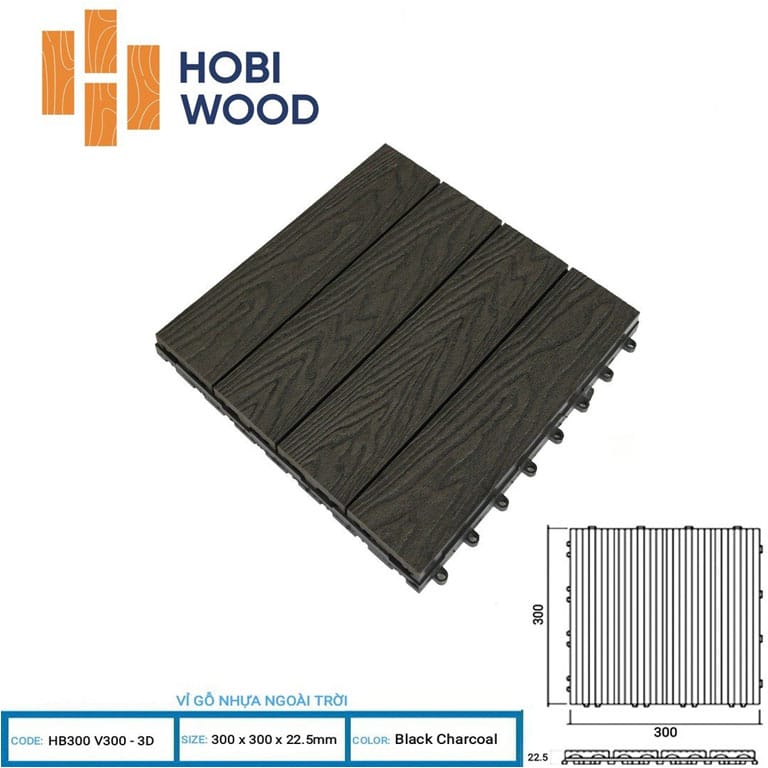Vỉ gỗ nhựa ngoài trời Hobi Wood Black vân 3D có kích thước 300mm x 300mm x 22,5mm.